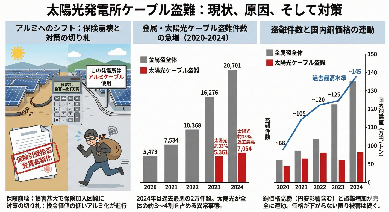 対策の切り札:対策として、盗まれても換金価値がほとんどない**「アルミケーブル」**への切り替えが急速に進んでいます。「この発電所はアルミケーブル使用」という看板自体が防犯対策になるほどです。