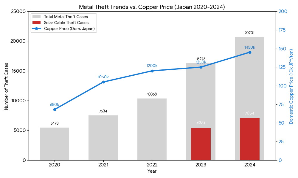 止まらない被害:2024年は銅価格が過去最高水準で推移しており、それに呼応して盗難件数も過去最悪(2万件超)を記録しました。価格が下がらない限り、この傾向は続くと予想されます。