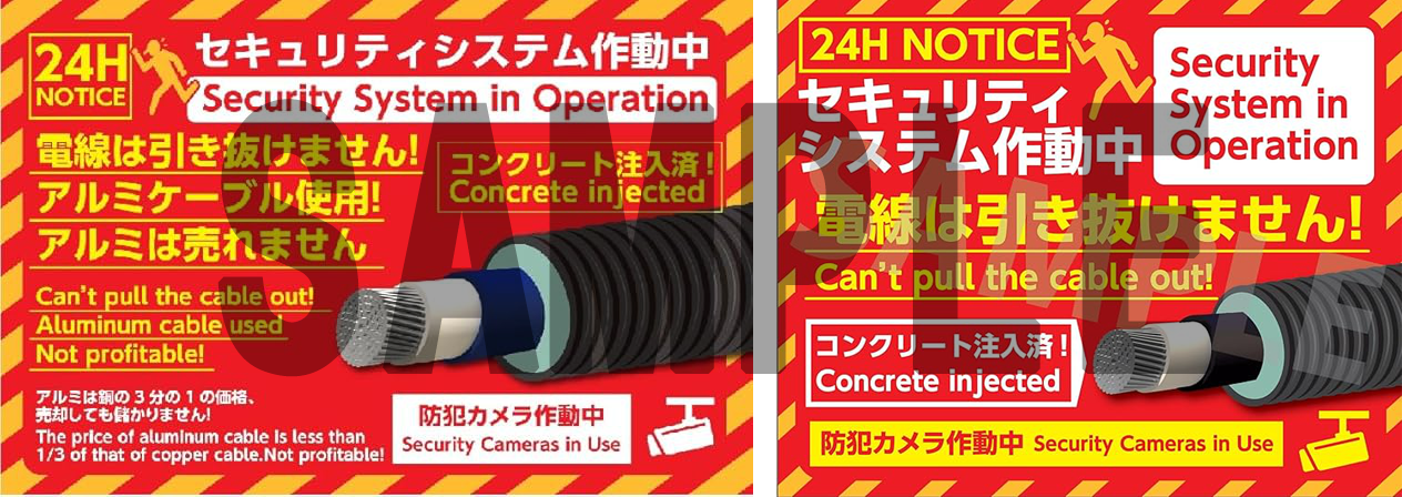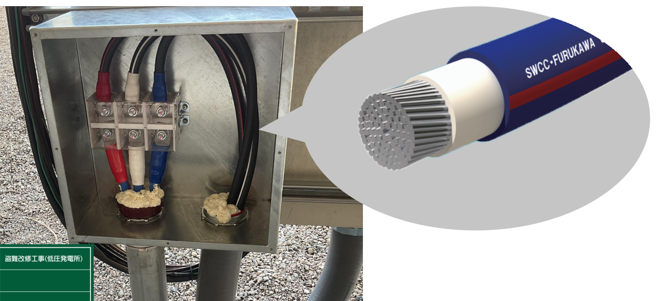 低圧の太陽光発電所において、ケーブルの長さが長い場合でも有効な対策です。また、盗難にあった発電所は再度狙われやすくなるため、盗難後の対策として、アルミケーブルでの配線のやり直しが推奨されます。
