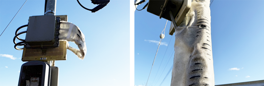 FRP樹脂と金網を用いて、ケーブルやエフレックス管に対する物理的な補強施工を行っています。これにより、切断が非常に困難になるだけでなく、外観からも犯行を抑止する効果が期待できます。