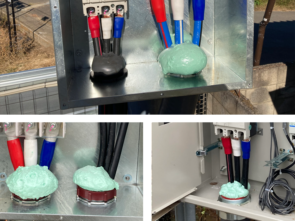 ケーブル管内に特殊溶剤を注入し、中で硬化させることでケーブルを物理的に固定します。