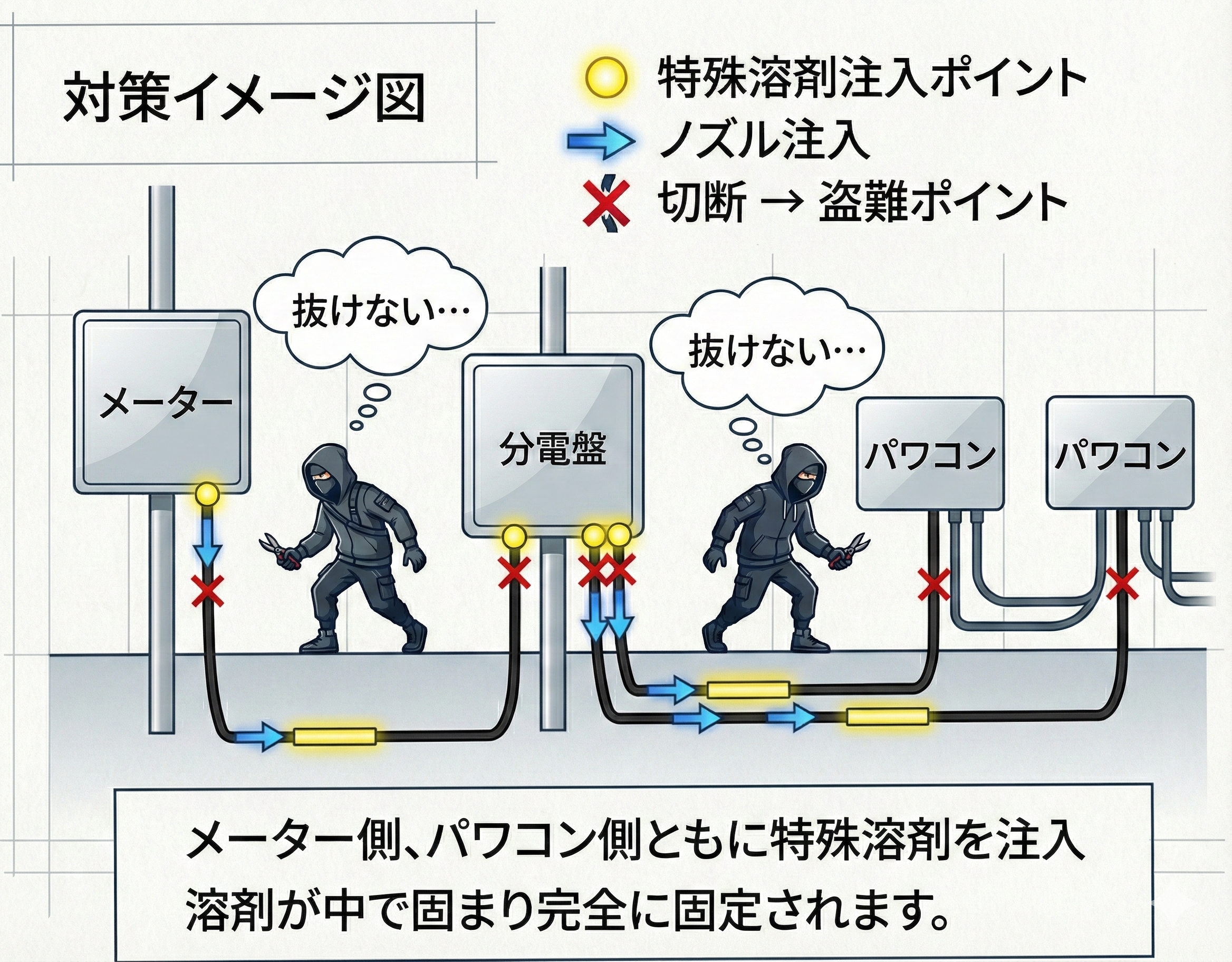 本対策は比較的安価で導入でき、特に銅線がむき出しになっている箇所や、切断されたくないエフレックス管に対して高い効果を発揮します。さらに、銅線の引き抜き防止対策と併用することで、盗難リスクを大幅に低減することが可能です。
